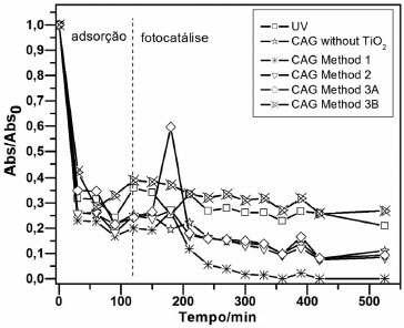 Os resultados apresentados na Figura 5 e na Tabela 3 mostram que é necessário um pré-tratamento dos suportes para remover o excesso de TiO2 sobre o mesmo, permitindo assim a recuperaçao e reutilizaçao do catalisador erodido. Tal pré-tratamento seria simples e consistiria na exposiçao do material às condiçoes operacionais de agitaçao e posterior recuperaçao do suporte e secagem do mesmo. Dessa forma o TiO2 desprendido na água poderia ser recuperado e utilizado para fazer nova imobilizaçao de meios suportes. Ensaios de Fotodegradaçao Foram realizados ensaios de fotodegradaçao do fármaco SMX para avaliar a atividade fotocatalítica do CAG-TiO2 obtido com os diferente métodos de imobilizaçao testados. A Figura 6 apresenta os resultados da fotodegradaçao em batelada no ensaio que durou 530 min. Percebe-se que a imobilizaçao utilizando tinta sem calcinar (método 3B) foi a que proporcionou menor porcentagem de remoçao, aproximadamente igual aquela obtida apenas por fotólise direta (UV). Essa remoçao foi menor inclusive do que a que ocorre com CAG in natura, condiçao em que predomina a adsorçao. Tais resultados indicam que o TiO2 nao estava disponível para a fotocatálise e que o recobrimento do CAG com tinta diminuiu sua capacidade de adsorçao. Por outro lado, a calcinaçao da tinta expoe o TiO2 e favorece a fotodegradaçao de SMX, mas por outro lado aumenta a erosibilidade do catalisador, como visto anteriormente.
