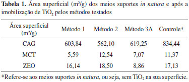 A partir da Tabela 3 pode-se concluir que o método de imobilizaçao mais eficiente foi método 1 (suspensao de TiO2) para todos os meios suportes. Além disso, pode-se concluir que o método 3A (dopagem de tinta seguido de calcinaçao) nao foi adequado uma vez que resulta em baixa fixaçao de TiO2 (< 7%), o que provavelmente comprometeria a atividade fotocatalítica do material obtido. De acordo com os dados da Tabela 3 o CAG pode ser considerado o melhor material suporte, provavelmente por ser mais poroso e possuir maior área superficial. Além disso, este é o material suporte mais leve dentre os testados, logo o gasto de energia para fluidizaçao ou expansao do meio suporte também seria menor. No método de recobrimento sol-gel observa-se que a massa de TiO2 imobilizada foi muito pequena para os materiais ZEO e MCT. Para o CAG o balanço de massa foi negativo, provavelmente devido à grande perda de massa na calcinaçao da resina, o que inviabilizou a determinaçao da massa de TiO2 efetivamente imobilizada. Foram realizadas análise por microscopia eletrônica (MEV) para todos os materiais obtidos a partir de meios suportes e técnica de imobilizaçoes diferentes, porém, como os resultados foram bem semelhantes de um material para o outro, optou-se por apresentar apenas as micrografias do CAG (Figura 4), que foi o material escolhido para os ensaios de fotodegradaçao.