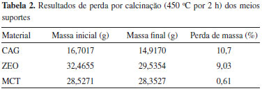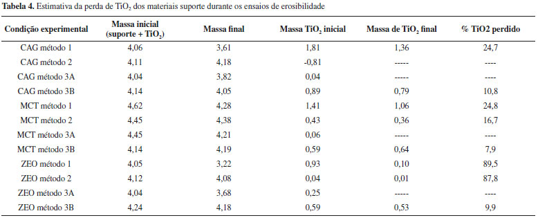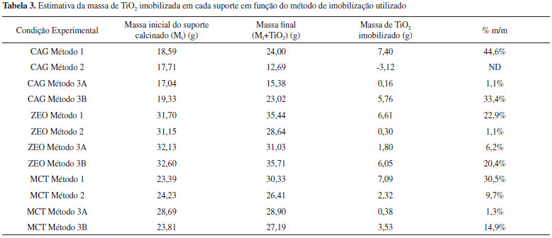 Nota-se que os materiais CAG e ZEO tiveram maior perda de massa o que é coerente com sua composiçao, sendo o primeiro um material predominantemente orgânico e o segundo, embora seja um aluminossilicato, também apresentou perda de massa devido à desidrataçao e reaçoes de desidroxilaçao. Já para o MCT pode-se dizer que a perda de massa é desprezível, o que é coerente com o fato desse material ter sofrido calcinaçao durante sua fabricaçao. Embora as condiçoes de armazenamento e a umidade do ar possam ter contribuído para a absorçao de água e aumento de massa do MCT, os resultados apresentados indicam que essa foi desprezível. A estimativa de massa de TiO2 imobilizado foi feita para cada meio suporte e método de imobilizaçao considerando a massa dos materias in natura (controle) e após o processo de recobrimento, descontando-se apropriadamente a perda de massa por calcinaçao. Conforme pode-se observar (Tabela 3), para apenas um material nao foi possível estimar a massa de TiO2 imobilizada.