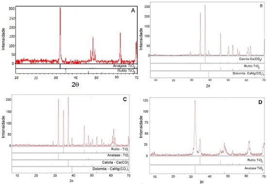 Figura 1. Difratograma de raios-X de amostras de TiO2 (A), tinta sem dopar (B), tinta dopada com TiO2 (C) e isopropóxido de Ti (D)