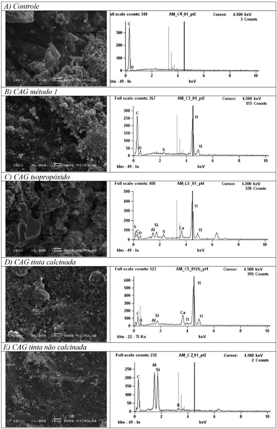 Figura 4. Micrografia e análise química dos diferentes materiais: A) Controle, B) CAG método 1, C) CAG isopropóxido, D) CAG tinta calcinada, E) CAG tinta nao calcinada