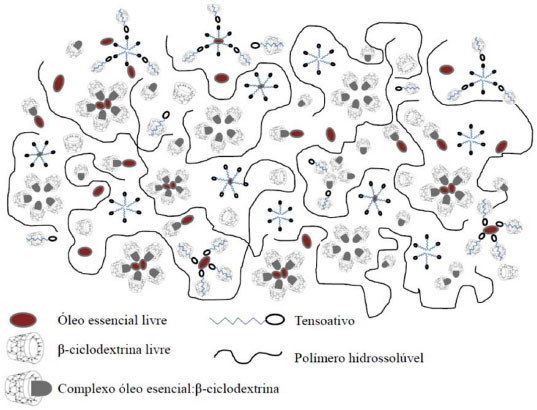 ![]() Figura 5. Representaçao dos vários tipos de interaçoes que possam ocorrer em sistemas de complexaçao multicomponentes contendo óleo essencial, β-ciclodextrina, tensoativo e polímero hidrossolúvel (Adaptado de Miranda et al.10)