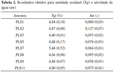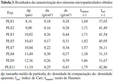 Os complexos de inclusao obtidos foram submetidos á secagem em spray drying. Nas condiçoes de temperatura do ar de secagem de 160 ºC, vazao do ar de secagem 60 m3 h-1 e vazao de alimentaçao de suspensao 4 g min-1, alimentada a um atomizador tipo duplo fluido com mistura interna com pressao e vazao do ar de atomizaçao respectivamente de 2,5 kgf cm-2 e 17 lpm. Rendimento do processo A recuperaçao (REC) foi determinada por balanço de massa através da diferença entre a massa teórica de sólidos presentes na suspensao alimentada e a massa do produto seco obtido, sendo o resultado expresso em porcentagem.3 Caracterizaçao físico-química Os complexos de inclusao β-CD:OE obtidos foram caracterizados quanto ao teor de umidade, atividade de água, solubilidade, distribuiçao granulométrica e tamanho médio de partícula, morfologia, densidade aparente e de compactaçao e eficiência de encapsulaçao. Umidade residual (Xp) A umidade residual foi avaliada através de titulador Karl Fischer (mod. 870KF Tritino plus Metrohm). Utilizou-se 100 mg de micropartículas para cada determinaçao. Os resultados foram expressos em forma de média (desvio padrao). Atividade de água (aw) A aw foi determinada em um medidor de atividade de água (AquaLab 4TEV Decagon Devices) à temperatura de 25 ºC, utilizando-se sensor de capacitância. As análises foram realizadas em triplicata e os resultados expressos por média (desvio padrao). Solubilidade A solubilidade foi determinada de acordo com método descrito por Tonon,13 com modificaçoes. 1 mg de amostra foi pesada e adicionada em 10 mL de água purificada, após esta suspensao ficou em agitador magnético por 30 minutos. A suspensao foi centrifugada a 3500 rpm, por 5 minutos. Pesou-se o sobrenadante em uma placa de petri, a qual foi levada à estufa a 105 ºC, até peso constante. A solubilidade foi calculada pela diferença de peso. Distribuiçao granulométrica e tamanho de partícula A distribuiçao granulométrica dos complexos de inclusao obtidos foi determinada por microscopia ótica e análise de imagens. Amostras do produto seco foram dispersas em uma lâmina de vidro. Imagens foram obtidas em um microscópio óptico Olympus mod. BX60MIV em aumento de 50 vezes, capturadas por uma câmara digital e analisadas em um software de análise de imagens (Image Pro-plus versao 7.0).14 Microscopia eletrônica de varredura (MEV) A morfologia das partículas foi avaliada em microscópio eletrônico de varredura (Zeiss mod. EVO 50) com atmosfera a vácuo de 10-5 torr. As micrografias foram geradas no modo topográfico a 12 kv, com aumento de 200, 1000, 5000 e 10000 vezes. Densidade aparente e de compactaçao As densidades aparente (da) e de compactaçao (dc) foram determinadas a partir de compactador automático CALEVA, TDT 1-23. Realizou-se três determinaçoes de volume, com 10 batidas, 500 batidas e 1250 batidas usando o método I da farmacopeia americana, onde a amostra é submetida a um impacto de altura de 14 mm. A partir de da e dc foram calculados o índice de Carr (Icarr) e a Razao de Hausner (IHausner). O Icarr (Equaçao 1), indica a capacidade de compactaçao e compressibilidade de um pó ou granulado, em forma percentual; sendo os valores entre 5 e 15% considerados com excelente capacidade de compactabilidade e compressibilidade.15 ![]() O valor do IHausner pode ser calculado pela Equaçao (2). Valores de IHausner menores que 1,25 indicam bom fluxo, valores maiores que 1,5 indicam fluxo ruim e valores entre 1,25 e 1,5 indicam a necessidade de adiçao de lubrificantes para melhorar o escoamento.15 ![]() Eficiência de encapsulaçao (EE) Para quantificar o teor de OE encapsulado, foi realizado o método de hidrodestilaçao usando aparelho de Clevenger, conforme descrito em Reineccius et al.,16 com algumas modificaçoes. Em um balao de fundo redondo foi adicionado 5 g dos complexos CB, CT ou CQ, água destilada (120 mL) e esferas de vidro. O aparelho de Clevenger foi conectado ao balao, e o braço do aparelho foi condicionado com 10 mL de água. O sistema foi deixado em refluxo por 2 horas. A massa de OE foi utilizada para determinaçao da EE conforme Equaçao (3). ![]() RESULTADOS E DISCUSSAO Umidade residual (Xp) A umidade residual foi determinada pela quantidade de água presente na amostra através do método direto baseado na reaçao quantitativa da água com soluçao volumétrica (reagente de Karl Fischer). Os produtos secos apresentam teor de umidade entre 4,40% e 5,48% (Tabela 2). Este resultado relaciona-se com as condiçoes de secagem (temperatura do ar de entrada e saída), que foram idênticas para todas as amostras. O uso de adjuvantes também pode influenciar nos valores de umidade residual,3 as diferenças observadas quando se compara os CB com CT e CQ (Tabela 2) nao apresentam significância estatística.