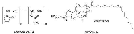 Devido à sua estrutura tronco-cônica, formada por moléculas de D-glicose, as ciclodextrinas possuem capacidade de complexaçao molecular através da substituiçao das moléculas de água encontradas no meio e no interior da cavidade, que possuem elevada entalpia, por moléculas hóspedes com características hidrofóbicas. Trata-se de um processo energeticamente viável por promover uma alteraçao favorável de entalpia, aumento de entropia e reduçao da energia total do sistema, fatores que contribuem para o aumento da estabilidade do complexo formado. Interaçoes eletrostáticas de Van der Waals, interaçoes hidrofóbicas e ligaçoes de hidrogênio também contribuem para formaçao e estabilizaçao dos complexos de inclusao.9 Por serem capazes de interagir com uma grande variedade de moléculas hóspedes e conferir propriedades multifuncionais a alimentos e insumos farmacêuticos, as CDs têm sido utilizadas como carreadores de inclusao molecular melhorando a solubilidade e estabilidade de ingredientes sensíveis como aromas e óleos essenciais. A principal propriedade das CDs é a capacidade de alterar as características físico-químicas de compostos com baixa solubilidade por meio da formaçao de complexos de inclusao.10 Em determinadas situaçoes, a eficiência da complexaçao é baixa, inviabilizando o processo, problema que pode ser contornado pela adiçao de polímeros e/ou tensoativos gerando complexos multicomponentes, técnica que provoca um efeito sinérgico. Quando se adiciona um polímero ou tensoativo na soluçao de CD, obtêm-se complexos ternários; quando se adiciona ambos, sao obtidos complexos quaternários.10,11 A adiçao de polímeros e tensoativos aos complexos de inclusoes resultam em um aumento da solubilidade e/ou da taxa de dissoluçao do composto ativo a ser complexado requerendo menores quantidades de CD para formaçao do complexo. Para a avaliaçao do efeito sinérgico entre CD, polímero e tensoativo, na eficiência de formaçao de complexos binários, ternários e quaternários, utilizou-se neste estudo o kollidon VA 64 (polímero solúvel em água) e o tween 80 (tensoativo) cujas estruturas químicas estao apresentadas na Figura 3. O kollidon VA 64 (Copolímero de 1-vinil-2-pirrolidona e vinil acetato) é muito empregado na indústria farmacêutica como agente formador de filme, granulante, aglutinante e incrementador de dissoluçao. O tween 80 (polissorbato 80) é um tensoativo nao-iônico, estabilizante, agente molhante e solubilizante muito empregado na obtençao de emulsoes tipo óleo em água (O/A). Tem sido empregado com sucesso na formaçao de complexos de inclusao ternários (fármaco/CD/tensoativo) visando aumento da eficiência de complexaçao do fármaco com reduçao das quantidades requeridas de CD para formaçao do complexo, resultando em reduçao de efeitos tóxicos e diminuiçao de custos associados com as ciclodextrinas.12