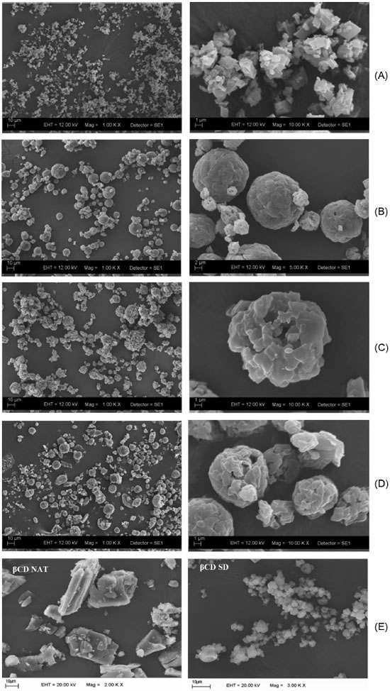 Figura 6. Micrografia dos complexos de inclusao: (A) CB; (B) CT; (C) CT; (D) CQ e (E) β-CD in natura e β-CD spray drying