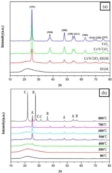 ![]() Figure 1. (a) XRD patterns of different materials. (b) XRD patterns of Cr/S/TiO2-HGM at different temperatures (A: anatase, R: rutile, C: cristobalite)