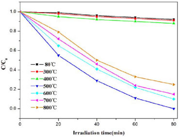 Photocatalytic activity The photocatalytic activity of all samples is given below. This was evaluated by degradation of indigo carmine under irradiation with visible light. The initial concentration of indigo carmine is 20 mg L-1, and the degradation time is 80 min. The effect of calcination temperature on the Cr/S/TiO2-HGM photocatalytic activity Figure 5 shows the effect of the calcination temperature on the photocatalytic activity. Samples of Cr/S/TiO2-HGM and their photocatalytic performances are different. The samples calcined at 80, 300 and 400 ºC have negligible photocatalytic activity. The photocatalytic activity of the 500 ºC sample is the highest. From 600 to 800 ºC, the photocatalytic activity of the samples decreased as a function of temperature. It is widely accepted that the high calcination temperature usually results in larger particle sizes and smaller specific surface areas.31 This is not in favor of the photocatalytic activity. In summary, this study identified 500 ºC as the optimal calcination temperature.