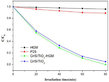The comparison of different materials photocatalytic activity Figure 7 shows the photocatalytic activity of P25-TiO2, Cr/S/TiO2, Cr/S/TiO2-HGM, and HGM as a function of visible light irradiation time. The HGM has negligible photocatalytic activity. The photocatalytic activity of P25-TiO2 in visible light is very low, and it is well known that P25-TiO2 does not absorb visible light. The Cr/S/TiO2 and Cr/S/TiO2-HGM have high photocatalytic activity under visible light. Compared Cr/S/TiO2 with Cr/S/TiO2-HGM, the Cr/S/TiO2-HGM increases the specific surface area because of HGM. Thus, its photocatalytic activity is higher than the Cr/S/TiO2. From a practical perspective, the powdered Cr/S/TiO2 is not conducive to recycling, but the Cr/S/TiO2-HGM effectively solves the problem.
