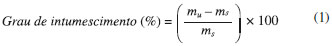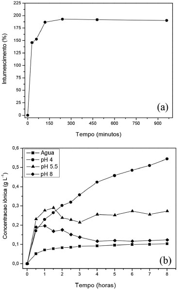 Caracterizaçao estrutural, morfológica e composiçao química dos materiais Espectros de infravermelho por transformada de Fourier (FTIR) foram registrados varrendo a regiao do espectro eletromagnético entre 4000 a 400 cm-1, usando um Espectrômetro Bomem, modelo MB100 equipado com detector DGTS e técnica de pastilha em KBr para sólidos. Ensaios de difraçao de raios-X (DRX) foram realizados em um difratômetro D8 Discover em configuraçao padrao OP1: passo 0,02, t = 6 s, 10 rpm, twin primária 0,6 mm = 0,3º, soller axial primária, twin secundária aberta fixa 5 mm = 2,5º, soller axial secundária, filtro de níquel, detector modo ID aberto 2,94º, com feixe de cobre e configuraçao 40 kV, 30 mA, monitorando os ângulos de difraçao 2 theta (2θ) de 0 a 30º, sobre amostra na forma de pó. Imagens de microscopia eletrônica de varredura (MEV) das microesferas foram registradas em um microscópio eletrônico modelo HITACHI TM3000, com tensao de aceleraçao de 15 kV, fonte de tungstênio. Análises de espectroscopia de absorçao atômica foram realizadas por um espectrômetro de absorçao atômica Varian AA240FS Fast Sequential AAS para determinar os teores dos macronutrientes. A abertura da amostra foi feita com digestao nítrico-perclórico (razao 3:1), visando solubilizar totalmente a amostra sólida. A estabilidade térmica das amostras foi determinada por análise termogravimétrica, sendo as amostras aquecidas à taxa de 10º / minuto de 25 a 1100 ºC, sob atmosfera de ar sintético em um equipamento da marca NETZCH modelo STA 449 F3. Ensaio de intumescimento Amostras de microesferas previamente pesadas foram imersas em água destilada. Após intervalos de tempos pré-determinados, as microesferas foram retiradas do solvente e novamente pesadas. O grau de intumescimento (%) da amostra foi calculado a partir da Equaçao 1, sendo mu a massa úmida após a imersao e ms a massa inicial seca do material. ![]() Influência do pH na taxa liberaçao A influência do pH na taxa de liberaçao foi avaliada por ensaios de condutividade iônica em diferentes meios de liberaçao, incluindo água e soluçoes tampao (pH 4, ácido acético; pH 8, ácido bórico e pH 5,5, ácido acético, que simula o pH do solo), Tabela 2. Amostras de microesferas contendo fertilizante foram imersas em cada meio à temperatura ambiente e, após intervalos de tempos específicos, alíquotas das soluçoes foram coletadas e quantificadas através de um condutivímetro microprocessado GEHAKA modelo CG 2000. A concentraçao de íons em soluçao foi determinada usando uma curva de calibraçao do respectivo fertilizante. As análises de condutividade iônica foram realizadas em triplicata.