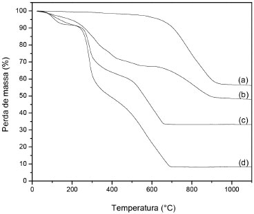 ![]() Figura 2. Curvas TG de argila-nutriente (a), QAFp (b), QAFmcd (c) e quitosana (d)