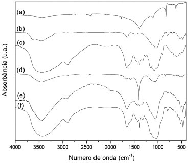 ![]() Figura 3. Espectro de FTIR do fertilizante (a), argila (b), quitosana (c), QAFp (d), QAFmcs (e) QAFmcd (f)
