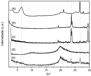 ![]() Figura 4. Difratogramas de raios-X de argila montmorilonita (a), fertilizante KNO3 (b), argila-nutriente (c), quitosana (d) e QAFmcd (e)