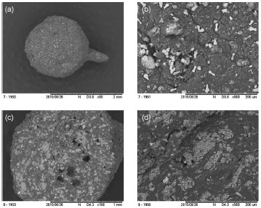 ![]() Figura 5. MEV da microesfera dupla camada da superfíce (a, b) e da regiao da fratura (c, d)