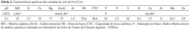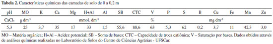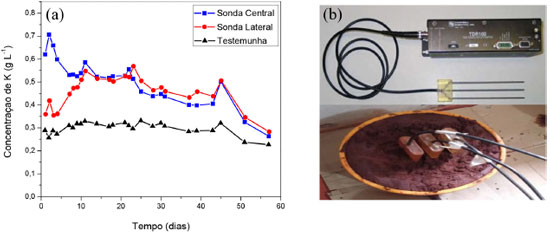 Ensaios de liberaçao em solo Ensaios in situ foram realizados e acompanhados por medidas de condutividade elétrica utilizando a técnica da TDR (Reflectometria no Domínio do Tempo). Esta técnica permite calcular o teor de água e a condutividade elétrica do solo utilizando mediçoes em tempo real.16,17 Para a realizaçao do experimento, as microesferas contendo KNO3 foram acondicionadas em baldes de 7,5 L preenchidos com solo (latosso vermelho distrófico típico), a uma profundidade de 10 cm ao meio dos baldes. A Tabela 2 mostra as características químicas do solo. As sondas, que fazem a medida elétrica, foram imersas em dois pontos: uma ao meio atingindo as microesferas e duas nas laterais do balde com 5 cm de distância, para avaliaçao da liberaçao de fertilizantes da microesferas ao longo de todo perfil do balde, Figura 7b. Os dados foram obtidos diariamente e, sempre que necessário para manter a umidade do solo (de acordo com a capacidade de campo), realizava-se a irrigaçao do sistema.