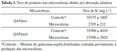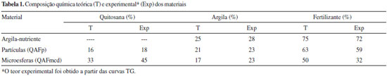 RESULTADOS E DISCUSSAO Composiçao química, caraterizaçao estrutural e morfológica O fertilizante KNO3 utilizado como fonte de potássio e nitrogênio vem sendo estudado em nosso grupo como um sistema padrao para avaliar os métodos de encapsulaçao e de liberaçao em diferentes meios e análise direta no solo.6 Neste trabalho, híbridos de quitosana-argila foram preparados em sistemas de dupla camada e os materiais foram caracterizados química, estrutura e morfologicamente. A Figura 2 mostra os resultados de TG para as amostras analisadas. Observa-se que a degradaçao ocorre em três etapas principais, exceto para a amostra argila-nutriente. As etapas de perda de massa observadas para as amostras de quitosana, QAFp e QAFmcd ocorrem aproximadamente nos intervalos de 25 a 196 ºC, 282 a 416 ºC e 516 a 910 ºC, os quais sao atribuídos a perdas de água residual, à decomposiçao do polímero através de desacetilaçao-despolimerizaçao, degradaçao dos resíduos finais do polímero e do fertilizante,18 respectivamente. As curvas TG sao importantes na determinaçao da composiçao de materiais, principalmente para materiais inorgânicos baseado em análises comparativas dos componentes dos materiais. Baseado na Tabela 1, verifica-se que o teor de fertilizante se mantém constante nos materiais argila-nutriente e QAFp, mas há uma perda de fertilizante para as microesferas de camada dupla. Esta perda está relacionada com o processo de gotejamento das soluçoes quitosana-argila-fertilizante e à lavagem das microesferas com água até pH neutro. Partículas de quitosana-argila-fertilizante foram obtidas pela simples mistura em soluçao dos componentes quitosana e argila-nutriente e levados à evaporaçao do solvente sem prévia lavagem para neutralizaçao do pH. Estes dados corroboram com os resultados obtidos por absorçao atômica em que aproximadamente 66% do nutriente potássio permaneceu encapsulado no material. Apesar da perda de ~34% do fertilizante após a obtençao das microesferas em pH neutro, ressalta-se que a preparaçao de dupla camada de quitosana é mais eficiente comparada à camada simples, em que os dados de absorçao atômica refletem que apenas 7% do fertilizante foi encapsulado, Tabela 3.