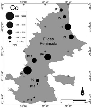 ![]() Figura 5. Distribuiçao da concentraçao de Co na Península Fildes - Antártica