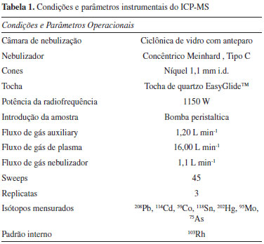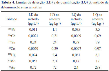 De acordo com a Associaçao Oficial de Química Analítica (AOAC) o valor que pode ser considerado como boa recuperaçao depende de fatores como a matriz em estudo, o preparo da amostra e a concentraçao na qual o elemento se encontra. Considerando que os valores dos elementos estudados sao de pequena ordem de grandeza, o intervalo aceito como adequado é de 75 a 120%.23 Assim, observando a Tabela 3, pode-se verificar que foram obtidas boas porcentagens de recuperaçao para o 208Pb, 118Sn e 95Mo sem o uso do padrao interno, indicando ausência de interferências e adequaçao do procedimento de análise. Para os dois isótopos de Cd e Hg, bem como para 59Co e 75As houve indicativo de interferências nas análises dos extratos. Essas interferências podem ser de ordem nao espectral e espectral. As interferências nao espectrais podem ser identificadas pela perda de sensibilidade da curva analítica e também podem estar relacionadas a problemas de transporte da amostra até o plasma. Essas interferências podem ser minimizadas por meio de equiparaçao de matriz, diluiçao da amostra, uso de padrao interno e adiçao de analito. Já as interferências espectrais ou isobáricas sao causadas por íons que apresentam a mesma razao massa/carga do elemento interferindo na intensidade do sinal analítico. Esse tipo de interferência pode ser contornada pela escolha de um isótopo alternativo.24 Para os dois isótopos de Hg obteve-se bons resultados de recuperaçao com o uso de padrao interno. Como nao foi observada diferença significativa entre os dois isótopos, optou-se pelo isótopo 202Hg, uma vez que é o mais abundante, com 29,8%. Assim, adotou-se o uso do PI Rh para as determinaçoes e a utilizaçao do isótopo 202Hg. Para o As também foram observados melhores valores de recuperaçao utilizando padrao interno Rh, que provavelmente minimizou as interferências nao espectrais que podem ocorrer para este isótopo. Na determinaçao do Cd pôde-se observar melhores porcentagens de recuperaçao com o uso de PI. Comparando os dois isótopos, observou-se que o 114Cd apresentou melhores valores de recuperaçao quando comparado ao 112Cd, ficando estabelecido a utilizaçao do 114Cd com padrao interno Rh para as determinaçoes. Para Co verificou-se que as recuperaçoes obtidas encontraram-se fora da faixa considerada adequada (75-120%).23 Ao utilizar o PI Rh, melhores valores foram obtidos, mas ainda estao abaixo da faixa de aceitaçao. Para este elemento foi verificado que a equiparaçao de matriz, a adiçao de analito e o uso de padrao interno nao contornaram as possíveis interferências. Sugere-se, entao, que os valores de recuperaçao nao satisfatórios estejam relacionados às interferências espectrais, uma vez que este elemento apresenta baixa relaçao massa/carga quando comparado aos demais elementos. Porém, devido ao isótopo 59Co apresentar abundância de 100%, nao foi possível estudar outra razao isotópica em busca de melhores resultados. Figuras analíticas de mérito Para a verificaçao do procedimento analítico foram avaliados alguns parâmetros e condiçoes de análise que sao utilizados para atestar a qualidade do seu método. Neste trabalho foram abordados três parâmetros (linearidade do método, LD e LQ), além do ensaio de adiçao de analito e recuperaçao. Para a avaliaçao da linearidade do método construiu-se curva analítica para cada elemento estudado e por meio de regressao linear obteve-se o coeficiente de determinaçao (R2). Os valores de coeficiente de determinaçao variaram de 0,9993 a 0,9998. Visto que a Anvisa recomenda que a curva analítica tenha um R2 maior ou igual a 0,999, pode-se inferir que o método proposto apresentou uma boa linearidade para todos os elementos.25 Os valores de limite de detecçao (LD) e limite de quantificaçao (LQ) foram obtidos a partir da análise do branco de preparo. Para o cálculo desses dois parâmetros foram utilizadas as definiçoes propostas pela IUPAC (LD = 3s/m e LQ = 10s/m, em que s é o desvio padrao estimado de 10 leituras do branco de preparo e m é a inclinaçao da curva analítica). Os resultados obtidos para esses dois parâmetros estao dispostos na Tabela 4 e sao adequados para a análise dos extratos de solo.
