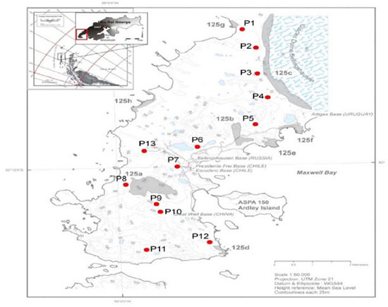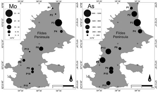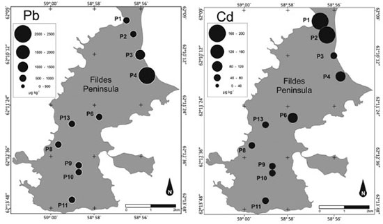 Utilizando os valores apresentados na Tabela 5 e o programa Surfer versao 8 Free Demo (Golden Software) foi realizada uma estimativa da distribuiçao de cada elemento nos solo coletados em toda Península Fildes. Para o Pb pode-se observar que maiores valores sao encontrados próximos a locais que recebem afluentes de degelo recente - amostras P3 e P4 (Figura 2). Era esperado que as amostras coletadas próximo a essa regiao de degelo recente apresentariam menores concentraçoes, uma vez que a regiao esteve coberta pelo gelo até poucos anos atrás, e isto foi observado para amostras P1 e P2. Porém, um evento provável de ocorrer é o processo de deposiçao atmosférica ocorrido na superfície da geleira, que torna possível o acúmulo ao longo de anos, e devido o processo de retraçao dessa geleira pode haver uma redisponibilizaçao os materiais acumulados. Vale ressaltar que próximo a esses pontos de coleta existe um rio proveniente do degelo tornando possível que pontos considerados intocados apresentem concentraçoes significativas de metal,26,27 o que pode justificar os maiores teores de Pb encontrados nas amostras P3 e P4.