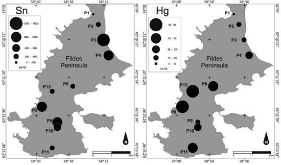 Para Cd verifica-se um comportamento de distribuiçao semelhante ao Pb (Figura 2). Estudo semelhante em solos da Península Fildes foi proposto por Amaro e colaboradores,28 no qual obtiveram concentraçao de Pb igual a 6200 µg kg-1 e Cd igual a 400 µg kg-1, superior aos valores encontrados nesse trabalho (525-2314 µg kg-1 para Pb e 55-194 µg kg-1 para Cd). Essa diferença de concentraçao observada pode ser devido aos diferentes procedimentos de digestao aplicados em cada trabalho, que pode influenciar na disponibilidade do elemento para quantificaçao, bem como a diferença dos pontos de coleta. No estudo da distribuiçao de Sn, observa-se pela Figura 3 que há duas regioes onde se concentram as amostras com maiores quantidades desse elemento, os pontos 3, 4 e 5 e os pontos 8, 9 e 10. Existe a possibilidade desses dois locais estarem recebendo uma carga de Sn devido à existência de estaçoes de pesquisa próximas, como a estaçao Artigas do Uruguai, localizada entre os pontos 4 e 5, e a estaçao Great Wall pertencente à China, localizada entre os pontos 9 e 10. Além disso, o ponto 8 fica próximo à única pista de pouso da ilha.