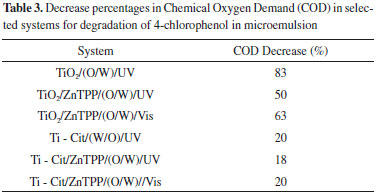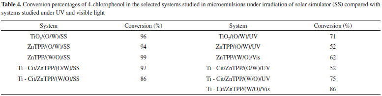Based on the possible ways of reaction mentioned above (the reported for TiO2 and Figure 2), the products of 4-CP degradation seem to come from processes involving both reduction and oxidation. However, when the degradation is developed in the presence of TiO2, the oxidation is the predominant path (commonly reported in the literature),26,33,36 meanwhile, when it is done in the presence of titanium citrate, the predominant process is reduction, followed by successive oxidations. This can be corroborated by taking into account the results of the study of the chemical oxygen demand (COD). This parameter represents the amount of oxygen required to oxidize the organic matter contained in a sample; its decrease means a lower concentration of total organic carbon in the system.19-21,26 The analysis of COD is used to measure the amount of organic matter in waters and it is widely used in water treatment systems to evaluate the efficiency of mineralization processes, both in the laboratory and in industry.42 This analysis includes only systems with the higher percentages of degradation (Table 3): TiO2 in O/W microemulsion and UV light 83%, TiO2/ZnTPP in O/W microemulsion and UV light 50%, TiO2/ZnTPP in O/W microemulsion and visible light 63%, Ti-Cit in W/O microemulsion and UV light 20%, Ti-Cit/ZnTPP in O/W microemulsion and UV light 18% and Ti-Cit/ ZnTPP in O/W microemulsion and visible light 20%. These values were corrected using the COD of the microemulsions without the main components of reaction. The surfactant that forms the microemulsion degrades very slowly in comparison with the organic compound.19,23-25 The COD values reveal that both 4-CP and its by-products follow the path up to the total oxidation.