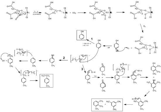 According to the parameter of toxicity LD-50 (fatal dose for half of a set of test organisms) of the intermediary compounds formed in the degradation of 4-CP, it is concluded that phenol is slightly more toxic than 4-chlorophenol, but both are more toxic than the trimethyl isomers of benzene and 4-ethyltoluene.39 These compounds can be considered stable intermediaries of a consecutive reaction mechanism, which involves reducing routes followed by successive oxidation routes carried out through the action of the free radicals generated.33,40 Therefore, it can be considered that the toxicity of solutions of 4-chlorophenol decrease continuously during the catalytic processes developed. In the cases of TiO2 and ZnTPP, their oxidant mechanisms have been extensively studied,4,27,28,30,32,36,41 and are summarized as follows: the treatment of the titanium compound with the appropriate radiation generates electron-hole, i.e., an electron from the valence band is excited and passed to the conduction band leaving a deficiency of charge or hole. The electrons in the conduction band could attack the molecules of oxygen present inducing the formation of superoxide radicals. The hydrogen peroxide formed by that route would also be under the attack of electrons in the conduction band, and originate hydroxyl radicals. The radicals so formed, mainly OH, would be responsible for the oxidation of the organic compounds. Produced positive holes interact with OH- groups or H2O molecules of the aqueous medium to generate hydroxyl radicals, which may also attack organic matter. Finally, a recombination of electron and hole on the semiconductor is possible, which takes the system to its initial state. Now, if the same process of irradiation is applied to the sensitizer porphyrin, an electronic jump may occur which causes the displacement of electrons from HOMO to LUMO orbital generating an excited singlet state. Then, a cross intersystem induces the porphyrin going to an excited triplet state. In these excited state, the sensitizer can directly oxidize the organic compound or interact with triplet oxygen. If this latter step occurs, singlet oxygen can be formed that either oxidizes the organic compound and/or generates superoxide radicals. The sensitizer becomes a cationic radical and reacts with a halogenated organic compound giving rise to oxidation by-products. Otherwise, if there are TiO2 and porphyrin mixed in the system, the irradiation could cause the promotion of an electron from the orbital LUMO of porphyrin to the titanium oxide conduction band, generating the sensitizer radical cation. These species react with oxygen in the medium and produce superoxide radicals that eventually transforms to hydrogen peroxide and hydroxyl radicals, which in turn oxidize any organic compound present. Finally, the radical cation of porphyrin can be recombined with the previously loaned electron to restore the initial system. Additionally, the separate reactions for TiO2 and porphyrin described above might also occur. Based on previous studies40 with iron citrate, which behaves in an equivalent manner to the titanium citrate, and the results of the present investigation, we propose a possible route for degradation of 4-chlorophenol in the presence of titanium citrate: The following proposed mechanism is based on the unusual methylation products formed during the light irradiations conditions used in this work and previous results reported40 on photolysis of Fe(III)-citrate complexes in aerobic water. Figure 1 shows the simplification of titanium-citrate molecule used in the graphical representation. The key events on the mechanism are: the Ti(IV)-citrate complex capacity to be reduced and re-oxided by dissolved oxygen to form superoxide radical and the homolytic methyl transfers from the surfactant to the 4-chlorophenol into the micelle interface. Details are shown in Figure 2. As depicted, UV light or visible light, in the presence of a photo sensitizer, i.e., ZnTPP, promotes titanium reduction and CO2 evolution via homolytic Ti-O bond cleavage. Water molecule transfers a radical proton to the citrate molecule to yield the corresponding alcohol; meanwhile Titanium is reduced to Ti (III) and OH substitutes CO2 as a ligand in the former complex. Dissolved oxygen oxidizes Ti back to Ti(IV) to yield superoxide radical (O2-). This radical catalyzes the lost of chloride from 4-chlorophenol to yield the aromatic radical from which several reduction paths occur. For instance, in path 1,34 phenol is produced via proton abstraction from water and/or from the surfactant (RH). In path 2, the radical phenol OH is homolytically cleaved and a methyl group from the surfactant is transferred to yield p-methylphenol. Methylphenol undergoes further methylation from the surfactant to give trimethylbenzene and ethylmethylbenzene. In path 3, p- and o- methyl transfers to methylphenol are shown. O2- superoxide initiates 4-chlorophenol homolytic cleavage and initiation of steps 2 and 3 might occur from hydroxyl radical as shown in Figure 2.