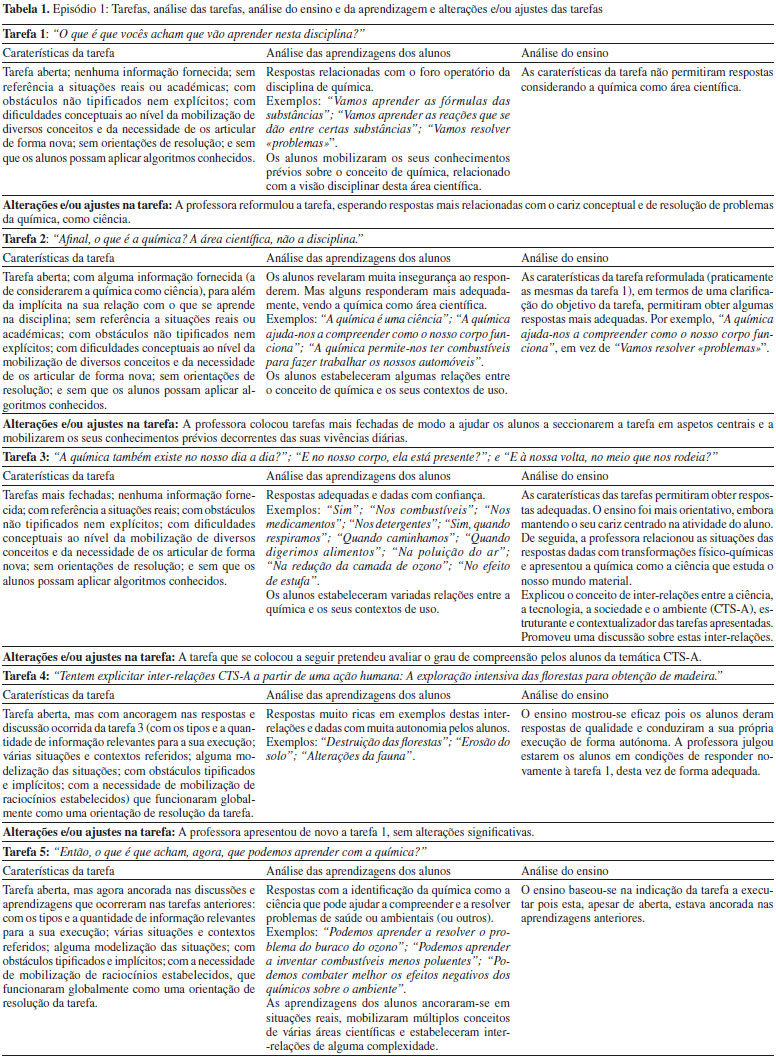 RESULTADOS E DISCUSSAO A análise dos três episódios de ensino foi feita em duas etapas. Na primeira etapa, cada episódio foi analisado individualmente em termos das categorias de análise: Caraterísticas da tarefa; Ensino que a tarefa proporciona; e Aprendizagem que a tarefa proporciona. Na segunda etapa, foram analisados globalmente os três episódios em termos da categoria de análise: Sequência de apresentaçao das tarefas. O primeiro episódio desenrolou-se a partir da promoçao, pela professora, de uma discussao sobre o significado do conceito de química como área científica e acerca da relevância da disciplina para a compreensao de fenómenos do dia a dia e de problemas ambientais. Considerou-se esta abordagem importante, numa das primeiras aulas da disciplina, por a química ser uma área científica fundamental na compreensao de fenómenos ambientais, sendo estes de enorme relevância na licenciatura em causa, Ecologia Aplicada. A Tabela 1 diz respeito ao episódio 1 e apresenta as tarefas que foram dadas aos alunos, a análise das tarefas (em termos das suas caraterísticas), a análise do ensino e da aprendizagem (em termos do que funcionou ou nao funcionou com as tarefas) e as alteraçoes e/ou ajustes que se tiveram de fazer nas tarefas. Analisando a Tabela 1, verificou-se que a primeira tarefa, com caraterísticas que a tornaram complexa para os alunos (tipologia aberta, nenhuma informaçao fornecida, sem referência a situaçoes reais ou académicas, ...), obteve respostas que indicaram dificuldades de compreensao do objetivo da tarefa, pois os alunos apenas mobilizaram os seus conhecimentos prévios sobre o conceito de química, relacionados com a visao disciplinar desta área científica. A reformulaçao da tarefa (tarefa 2) manteve a globalidade das caraterísticas da tarefa 1, mas os alunos continuaram com dificuldades na sua execuçao pois estabeleceram apenas algumas relaçoes entre o conceito de química e os seus contextos de uso. A professora entendeu, entao, que deveria incluir tarefas auxiliares de natureza menos complexa (tarefa 3), portanto com tipologia mais fechada e referindo algumas situaçoes reais. As respostas foram dadas com facilidade e indicaram que houve aprendizagens ao nível do estabelecimento de variadas relaçoes entre a química e os seus contextos de uso (ver Tabela 1). Nesta altura, pareceu oportuno apresentar e discutir conceitos novos e as suas relaçoes, designados genericamente por inter-relaçoes ciência-tecnologia-sociedade-ambiente (CTS-A), sendo este um conceito estruturante e contextualizador das aprendizagens anteriores. A aprendizagem das inter-relaçoes CTS-A foi avaliada com a tarefa 4, tarefa de tipologia aberta mas ancorada nas respostas e discussao ocorrida na tarefa 3 (com informaçao relevante para a sua execuçao, várias situaçoes e contextos referidos, alguma modelizaçao das situaçoes, ...). Por fim, foi dada a tarefa 5, na realidade praticamente igual à tarefa 1 em termos de formulaçao, com tipologia aberta, mas ancorada nas discussoes e aprendizagens anteriores (o que modificou as outras caraterísticas da tarefa 5 relativamente à 1). Tanto na tarefa 4 como na 5, tarefas de maior complexidade do que as anteriores, os alunos responderam com elevada autonomia e atingiram aprendizagens de maior nível de qualidade, pois apropriaram conceitos novos, reconstruindo os seus significados, reestruturaram os campos conceptuais em jogo e aplicaram-nos em contextos reais (ver Tabela 1).