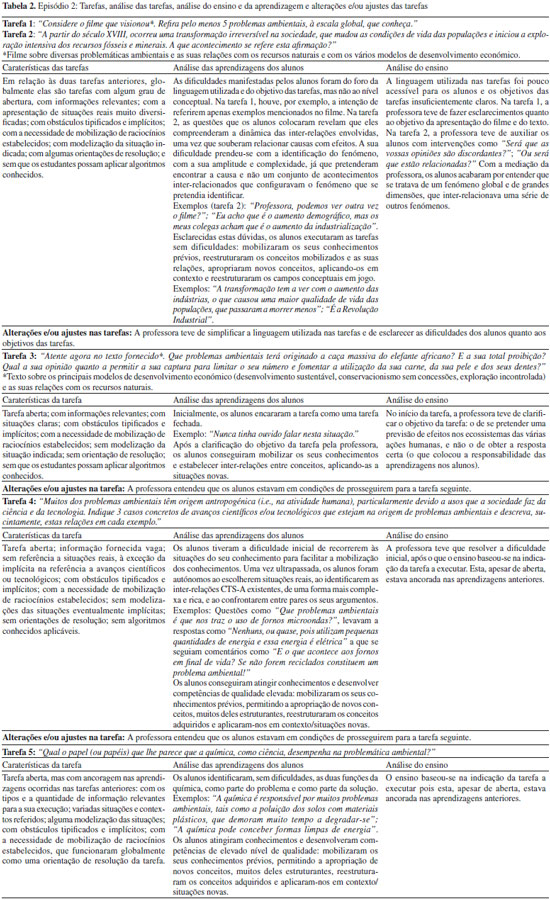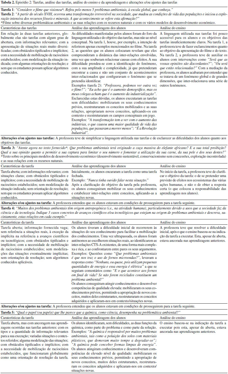 Portanto, da tarefa 3 à 5, os conhecimentos prévios dos alunos evoluíram para conhecimentos mais próximos dos aceites pela comunidade científica, o que se pode relacionar com a melhoria da qualidade das suas aprendizagens. A reflexao sobre os dados do ensino e das aprendizagens no episódio 1 parece indicar que quando se pretende que os alunos executem uma tarefa complexa, esta deve ser precedida por outras mais simples, que sirvam de âncora e de contextualizaçao (aos conhecimentos a mobilizar, às situaçoes químicas, às modelizaçoes a fazer das situaçoes, à orientaçao da execuçao da tarefa, entre outros exemplos). O segundo episódio analisado desenrolou-se com a discussao em pequeno e grande grupo de uma ficha de trabalho contendo sete tarefas. Foram apresentadas, no início da aula, inúmeras situaçoes ambientais e/ou químicas (por exemplo, a contaminaçao dos solos devido a aterros sanitários, a poluiçao atmosférica devido à atividade industrial, os incêndios florestais, as chuvas ácidas), através do visionamento do programa Ambiente e Crescimento Demográfico do filme Educaçao Ambiental,12 com a duraçao de cerca de 20 minutos. De seguida, os alunos, em pequeno grupo, discutiram o filme e responderam às tarefas 1 e 2. Posteriormente leram um texto sobre os principais modelos de desenvolvimento económico "Diferentes alternativas à problemática ambiental"13 (texto adaptado da fonte original, sobre desenvolvimento sustentável, conservacionismo sem concessoes, exploraçao incontrolada) e responderam à questao 3. Seguiu-se a execuçao das restantes tarefas. Note-se que durante o trabalho em pequeno grupo a professora interveio apenas perante a solicitaçao dos alunos. No final da execuçao da ficha de trabalho foi feita a discussao em grande grupo, em que a professora interveio essencialmente no sentido de mediar as aprendizagens dos alunos. A Tabela 2 diz respeito ao episódio 2 e apresenta algumas tarefas que foram dadas aos alunos (as mais relevantes para este estudo), a análise das tarefas (em termos das suas caraterísticas), a análise do ensino e da aprendizagem (em termos do que funcionou ou nao funcionou com as tarefas) e as alteraçoes e/ou ajustes que se tiveram de fazer nas tarefas.