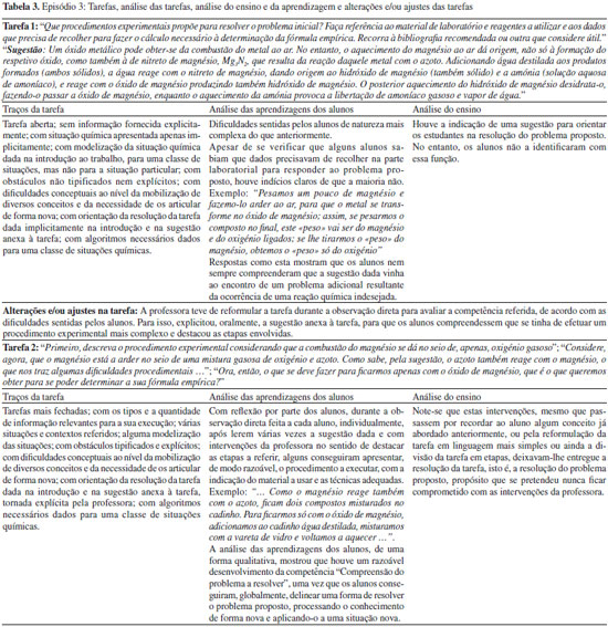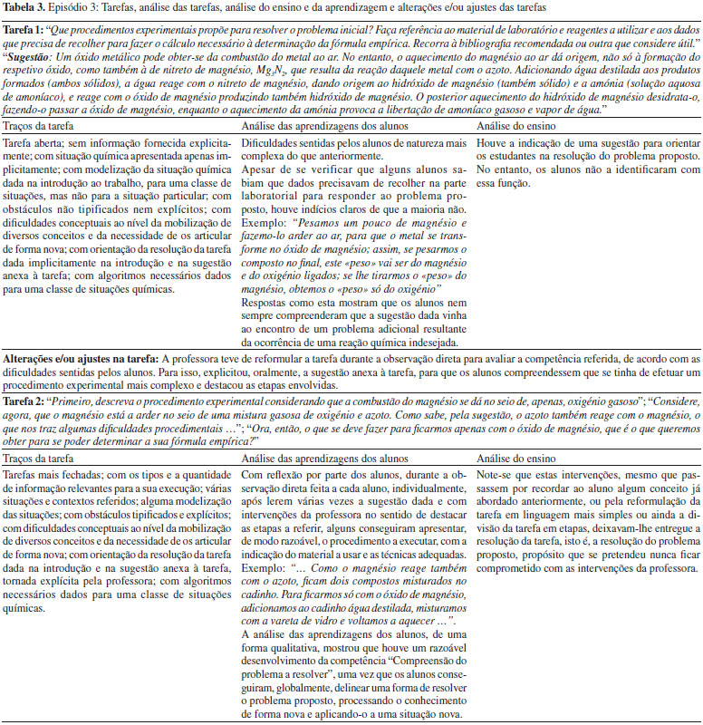 No episódio 2 pretendia-se a execuçao pelos alunos de uma tarefa complexa. Entao, a professora concebeu as primeiras tarefas (1 e 2) com caraterísticas que as simplificaram: de tipologia pouco aberta, com informaçoes relevantes, com a apresentaçao de situaçoes reais muito diversificadas, com obstáculos tipificados e implícitos, ... Verificou-se que os alunos apresentaram dificuldades que se prenderam com a linguagem utilizada e com a compreensao dos objetivos das tarefas (ver Tabela 2). Estas sao mais abertas do que as tarefas no ensino tradicional, têm obstáculos tipificados mas implícitos, há a necessidade de mobilizaçao de raciocínios estabelecidos, o contexto nao é o contexto da disciplina (por exemplo), o que ajuda a explicar as dificuldades acrescidas. Feitos os esclarecimentos necessários, as tarefas foram executadas sem dificuldades. Assim, apesar do ensino na tarefa 1 ter sido feito através da apresentaçao de um filme, em que sao os alunos que têm de selecionar os conceitos e as relaçoes relevantes para a execuçao da tarefa, estes eram já do seu conhecimento, quer pelas suas vivências, como resultantes das últimas aulas. As aprendizagens dos alunos consistiram apenas numa validaçao dos seus conhecimentos prévios. Na tarefa 2 as aprendizagens fizeram-se sem dificuldades, pois resultaram de confronto de ideias, da mobilizaçao de conhecimentos prévios (o conceito Revoluçao Industrial) e do estabelecimento de relaçoes entre conceitos. Os alunos mobilizaram os seus conhecimentos prévios, reestruturaram os conceitos mobilizados e as suas relaçoes, apropriaram novos conceitos, aplicando-os em contexto e reestruturaram os campos conceptuais em jogo. Seguiu-se a tarefa 3, de tipologia aberta, mas com informaçoes relevantes, com situaçoes claras, com obstáculos tipificados e implícitos, ... Uma vez mais, as dificuldades relacionaram-se com o objetivo da tarefa, a qual, após os devidos esclarecimentos, foi resolvida sem dificuldades. Os alunos conseguiram mobilizar os seus conhecimentos, estabelecer inter-relaçoes entre conceitos, aplicando-as a situaçoes novas. A tarefa 4 era de tipologia aberta, com informaçao fornecida vaga, sem referência a situaçoes reais explícitas, com obstáculos tipificados e implícitos, ... Os alunos foram autónomos ao escolherem situaçoes reais, ao identificarem as inter-relaçoes CTS-A existentes, de uma forma mais complexa e rica, e ao confrontarem entre pares os seus argumentos. Os alunos conseguiram atingir conhecimentos e desenvolver competências de qualidade elevada. Ou seja, mobilizaram os seus conhecimentos prévios, permitindo a apropriaçao de novos conceitos, muitos deles estruturantes, reestruturaram os conceitos adquiridos e aplicaram-nos em contexto/situaçoes novas. Tal como na tarefa 4, com a tarefa 5 (aberta, mas com ancoragem nas aprendizagens ocorridas nas tarefas anteriores), os alunos atingiram conhecimentos e desenvolveram competências de qualidade elevada. As várias tarefas, colocadas ao longo do episódio 2, foram sendo cada vez mais abertas, com cada vez menos informaçoes fornecidas ou de cariz mais vago, a apresentaçao de situaçoes reais foi sendo mais rara ou inexistente, ... Embora o ensino proporcionado tivesse, por vezes, um cariz orientativo, aquele esteve sempre centrado nos alunos e estes conseguiram aprendizagens gradualmente mais autónomas, envolvendo o estabelecimento de relaçoes novas entre conceitos ou aplicadas a situaçoes novas, conseguindo atingir conhecimentos e desenvolver competências de elevado nível de qualidade. A reflexao sobre os dados do ensino e das aprendizagens nos episódios 1 e 2 reforçam a convicçao de que quando se pretende que os alunos executem uma tarefa complexa, esta deve ser precedida por outras mais simples, que sirvam de âncora e de contextualizaçao para a construçao de conhecimento novo e o desenvolvimento de competências. O terceiro episódio analisado decorreu durante a observaçao direta para avaliar a competência "Compreensao do problema a resolver", do trabalho laboratorial "Determinaçao da fórmula empírica do óxido de magnésio". Foi dada uma tarefa com uma sugestao para orientar os alunos na resoluçao do problema proposto. Esta tarefa, apesar de recorrer a uma sugestao facilitadora do delineamento da resoluçao do problema, é de natureza mais complexa do que as apresentadas nos episódios anteriores, uma vez que diz respeito a uma competência (Compreensao do problema a resolver) que incorpora outras de mais baixo nível, mas que têm de estar relacionadas e articuladas para o desenvolvimento da competência em questao. A Tabela 3 diz respeito ao episódio 3 e apresenta as tarefas que foram dadas aos alunos, a análise das tarefas (em termos das suas caraterísticas), a análise do ensino e da aprendizagem (em termos do que funcionou ou nao funcionou com as tarefas) e as alteraçoes e/ou ajustes que se tiveram de fazer nas tarefas.