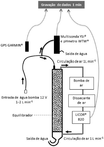 O estuário do Rio Sao Francisco (Figura 1b) está localizado na regiao Nordeste (SE/AL) do Brasil (10º15 - 10º33 S e 36º24 - 36º36 W). O Rio Sao Francisco, em descarga de água, é o segundo maior rio do Brasil. A bacia hidrográfica do Rio Sao Francisco cobre aproximadamente 639210 km2 e corresponde à mais extensa bacia hidrográfica dentro do território brasileiro.31 O domínio climático do estuário é classificado como quente e úmido.32 A precipitaçao acumulada anual no estuário do Sao Francisco varia entre 1.250 mm e 1.500 mm, sendo a estaçao chuvosa verificada entre os meses de maio a julho.33 Desde 1950, o rio vem sofrendo intensas modificaçoes ao longo de suas margens, principalmente com a construçao de barragens na forma de cascata, que controlam aproximadamente 98% da bacia de drenagem. As construçoes das barragens ao longo das margens do rio modificaram a hidrodinâmica, e atualmente a vazao é regular e constante de aproximadamente 2000 m3 s-1.34 A profundidade do estuário é variável, com média de aproximadamente 3 m. A zona costeira onde está inserido o estuário apresenta regime de mesomares semidiurnas. Os níveis baixos de clorofila a e nutrientes nas águas do estuário evidenciam as condiçoes oligotróficas.31,34 Procedimentos de amostragens A campanha amostral na Baía de Guanabara foi realizada entre abril de 2014 e abril de 2015, totalizando 9 campanhas amostrais.26 Na regiao do baixo Rio Sao Francisco, um total de 3 campanhas de amostragem foram realizadas, em agosto de 2014 e março e julho de 2015 (Figura 1). Em todas as campanhas, os procedimentos de amostragens consistiram em varreduras espaciais com o auxílio de embarcaçoes de pequeno a médio porte (média de 6 tripulantes por campanha) para mediçoes contínuas e em tempo real da pCO2, salinidade, temperatura, oxigênio dissolvido (OD), fluorescência, pH e posiçao geográfica, todos os parâmetros medidos e gravados com frequência de 1 minuto. Nas amostragens da Baía de Guanabara, uma bomba de água submersível (bomba de sucçao submersa CIBR 12V) foi acoplada na parte lateral da embarcaçao de modo a prover água em sub-superfície (0,5 m de profundidade) continuamente para o sistema de mediçao, com energia alimentada por baterias do tipo automotivas de 60 Ah. Nas amostragens do Rio Sao Francisco, a água foi provida para a embarcaçao através de uma bomba de porao disponível na própria embarcaçao, alimentada com bateria automotiva de 150 Ah e coleta de água a aproximadamente 0,5 m de profundidade. Essa profundidade de amostragem em sub-superfície é representativa da camada de água que realiza trocas gasosas na interface água-atmosfera, assumindo que até 0,5 m de profundidade a água é bem misturada. Além disso, caso a bomba esteja fixada a profundidades menores que 0,5 m existe a possibilidade de contato da bomba com o ar atmosférico (devido aos movimentos laterais da embarcaçao), prejudicando a qualidade das mediçoes. Amostragens discretas para AT e clorofila a foram coletadas em aproximadamente 20 estaçoes em cada campanha amostral (Figuras 1a e 1b). As amostras de água foram retiradas em sub-superficie (0,5 m de profundidade) com o auxílio de uma garrafa Niskin (3 L) e acondicionadas (colocadas a frio e no escuro) para posterior análise em laboratório. Em maio de 2013 também foi realizada uma amostragem de 25 horas em uma estaçao fixa localizada próxima à desembocadura da Baía de Guanabara de modo a testar potencialidades do sistema contínuo de mediçao para o monitoramento das variaçoes diuturnas dos parâmetros considerados nesse estudo. Procedimentos analíticos A alcalinidade total (AT) foi determinada em 100 mL de amostras de água filtradas com filtros GF/F. A técnica de análise foi baseada na titulaçao clássica de Gran,35 utilizando um sistema de titulaçao automático (Metler Toledo Mod. T50). A reprodutibilidade do método foi ± 3 µmol kg−1 (n = 7). A acurácia estimada das mediçoes foi de aproximadamente ± 7 µmol kg-1 de acordo com material de referência certificado para alcalinidade (CRM provido por A.G. Dickson, da Scripps Institution of Oceanography). Análises de clorofila a foram quantificadas segundo procedimentos descritos em Strickland e Parsons,36 utilizando o material contido nos filtros GF/F. As mediçoes contínuas de temperatura, salinidade, clorofila a e OD foram realizadas com o auxílio de uma multisonda YSI® 6600 V2, devidamente calibrada e inserida em uma estrutura acrílica customizada com fluxo de água corrente. A calibraçao do sensor óptico de OD foi realizada através do valor de saturaçao atmosférica (acurácia ± 3%). O sensor da salinidade foi calibrado com material certificado de condutividade (acurácia ± 0,1 na escala prática de salinidade). Os valores de temperatura do termômetro da multisonda foram confrontados com valores de outros dois termômetros (acurácia ± 0,1 ºC). A calibraçao do sensor de fluorescência foi realizada utilizando água deionizada como valor de base. Posteriormente, os valores de fluorescência foram correlacionados com as análises discretas de clorofila a a fim de derivar um fator de correçao.26 O pH foi medido continuamente e também discretamente com um pHmetro WTW 3310, equipado com um eletrodo Sentrix 41 e termômetro. A calibraçao do eletrodo de pH foi feita da forma "three-point standard", mediante valores certificados de pH de 4,01, 7,00 e 10,01 da marca WTW, de acordo com a escala da National Institute of Standards and Technology (NIST), antes e após cada amostragem. A precisao estimada das mediçoes de pH foi da ordem de 0,01. A pCO2 foi medida pela técnica da equilibraçao na qual um fluxo contínuo de água (1-2 L min−1) é bombeado para o sistema e segue a partir do topo do equilibrador para a base, enquanto um fluxo contínuo de ar segue na direçao contrária, da base para o topo (1 L min−1).16,19,37 A Figura 2 mostra detalhes do equilibrad