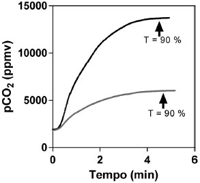 ![]() Figura 3. Variaçao da pCO2 em funçao do tempo para os testes do tempo de resposta. A curva em cinza representa o tempo de equilibraçao após adiçao de 0,5 mL de de HCl 0,1 N, e a curva em preto representa o tempo de equilibraçao após adiçao de 1 mL de HCl 0,1 N