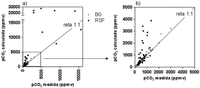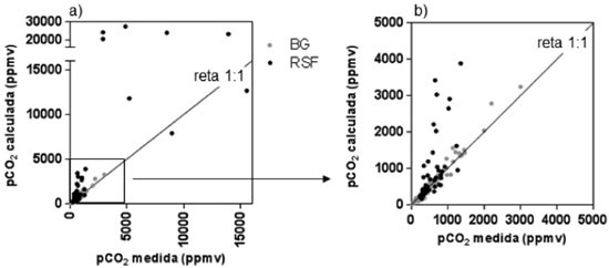 Figura 4. Comparaçao entre os valores calculados e medidos da pCO2. A Figura 4a contém todos os resultados obtidos nessa comparaçao. A Figura 4b representa somente os pontos inseridos dentro do quadrado desenhado na Figura 4a