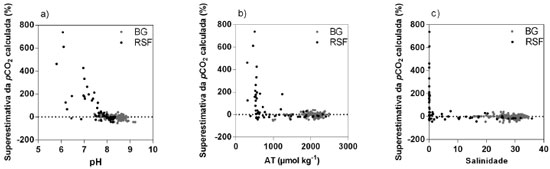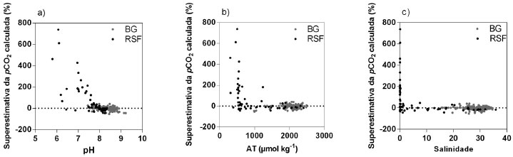 Figura 5. Comparaçao da superestimativa da pCO2 calculada entre os dois sistemas estuarinos. O gráfico 5a apresenta a superestimativa em funçao dos valores de pH; o gráfico 5b apresenta a superestimativa em funçao da AT; o gráfico 5c apresenta a superestimativa em funçao da salinidade