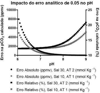 Em adiçao à problemática do cálculo da pCO2 descrita no parágrafo anterior, problemas nas mediçoes do pH também podem ser as causas de importantes discrepâncias entre os valores da pCO2 calculados e medidos. A Figura 6 apresenta os resultados teóricos da sensibilidade dos cálculos da pCO2 em funçao de um erro de 0,05 unidades no pH. Os erros foram estabelecidos para condiçoes típicas das águas da Baía de Guanabara (salinidade 30, temperatura 25 ºC, AT 2 mmol kg-1) e do estuário do Rio Sao Francisco (salinidade 10, temperatura 25 ºC, AT 1 mmol kg-1). As estimativas cobrem valores de pH entre 6 e 9. Por exemplo, para a Baía de Guanabara, em águas com salinidade média de 30, pH de 8,45 e AT de 2 mmol kg-1, um erro de 0,05 unidades (0,6%) no pH resulta em um erro de ± 16% no cálculo da pCO2. No estuário do Rio Sao Francisco, em águas com salinidade de 10, pH de 8,05, e AT de 1 mmol kg-1, um erro de 0,05 unidades (0,6%) no pH resulta em um erro de ± 13% na pCO2 calculada. Levando-se em conta que os cálculos dos fluxos de CO2 na interface água-atmosfera incluem o gradiente da pCO2 nessa interface, erros de apenas 0,05 nas mediçoes do pH podem levar a erros nos cálculos dos fluxos que passam de 20% em águas oligo-halinas a levemente meso-halinas.