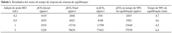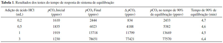 Testes de desempenho do equilibrador foram conduzidos em laboratório para determinar o tempo de resposta do sistema em funçao de mudanças abruptas nos valores da pCO2. Esses testes foram realizados adicionando quantidades de 0,2, 0,5, 1 e 3 mL de HCl 0,1N em um sistema de circulaçao de água de torneira com valores aproximados de alcalinidade de 0,451 mmol kg-1, pH de 7,5 (escala NIST) e temperatura de 25 ºC. Os procedimentos laboratoriais foram adaptados do trabalho de Frankignoulle et al.16 Adicionando ácido na água, uma certa quantidade da alcalinidade será neutralizada, produzindo imediatamente CO2 dissolvido no volume de água, que rapidamente se equilibra dentro do sistema. A entrada e a saída de água do sistema ficaram dentro de um mesmo recipiente contendo aproximadamente 15 L de água. Cálculos do sistema carbonato e estatística O cálculo da pCO2 foi realizado através dos valores medidos de AT e pH. Foram utilizadas as constantes de dissociaçao do ácido carbônico de acordo com Mehrbach et al.,38 reformuladas por Dickson e Millero,39 a constante de acidez do borato segundo Lee et al.,40 e o coeficiente de solubilidade do CO2 de Weiss.41 Todos os cálculos do sistema carbonato foram realizados no programa CO2calc® 1.2.9.42 Foi aplicado o teste estatístico de Shapiro-Wilk para testar a normalidade dos dados. Como os resultados nao apresentaram distribuiçao normal foi aplicado o teste pareado de Wilcoxon para testar a diferença entre médias. Regressoes lineares simples foram calculadas para comparar a pCO2 medida pelo sistema online de mediçao com a pCO2 calculada com base nos valores de pH e AT, com verificaçao do desvio da reta 1:1. O programa GraphPad Prism® 6.0 foi utilizado para os cálculos estatísticos.