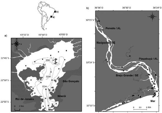 Figura 1. Mapas das áreas de estudos contempladas na presente pesquisa. A Figura 1a apresenta a Baía de Guanabara (RJ) com as linhas isobatimétricas (de 10 e 20 m) e os pontos de amostragens. A Figura 1b representa o sistema estuarino do Rio Sao Francisco (SE/AL), com os referentes pontos amostrados
