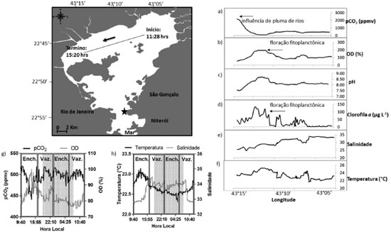 Exemplos das mediçoes em tempo real em estuários Para exemplificar a aplicaçao das mediçoes em escalas de pequenas variaçoes espaciais e temporais, a Figura 7 é apresentada com os resultados obtidos durante um fundeio de 25 horas na Baía de Guanabara. O traçado em preto no mapa indica o trajeto percorrido pela embarcaçao e a seta indica o sentido da rota. Ao lado direito do mapa da Baía de Guanabara é possível observar 6 gráficos contendo a variaçao espacial dos parâmetros ao longo do trajeto percorrido pela embarcaçao (parâmetro versus. Longitude), quando foi realizado um N amostral contendo 232 mediçoes (1 por minuto). Os gráficos 7a e 7b apresentam a variaçao dos valores da pCO2 e do OD (oxigênio dissolvido). As diminuiçoes nos valores de pCO2 concomitantes com aumentos nos valores de OD e clorofila a sao relacionados com as atividades fitoplanctônicas que consumiram o CO2 da água e liberaram OD através do processo da fotossíntese. Também nesses gráficos é possível observar a influência de plumas de rios poluídos (quando os valores de OD sao mais baixos e os valores de pCO2 sao mais altos). Esses resultados mostram que as variaçoes em curta escala espacial nao poderiam ser observadas com tanta precisao caso a amostragem fosse discreta e pontual (os valores da pCO2 alcançaram variaçoes além de 1500 ppmv em uma distância de apenas 300 m, aproximadamente). A velocidade de navegaçao da embarcaçao foi de aproximadamente 2,3 m s-1, configurando uma amostragem de alta resoluçao espacial (uma mediçao a cada 138 m, aproximadamente). Importante ressaltar que se os gradientes espaciais se tornam acentuados, é necessária a diminuiçao da velocidade de navegaçao em funçao do tempo de resposta do sistema de mediçao.