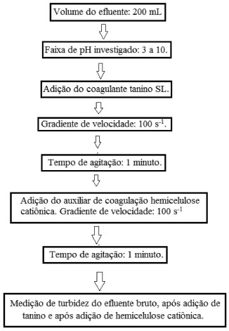 Caracterização dos derivados catiônicos da hemicelulose A espectroscopia vibracional de absorção no infravermelho da hemicelulose natural e dos seus derivados foi realizada utilizando o equipamento Shimadzu IR Prestige-21. As pastilhas foram preparadas com KBr (1/100 (m/m)). As análises termogravimétricas (TG/DTA) foram realizadas em um equipamento TGA-50, Shimadzu. A massa de amostra utilizada foi de 10 mg. As amostras foram aquecidas da temperatura ambiente até 900 ºC a uma taxa de 20 ºC min-1 em atmosfera de nitrogênio de fluxo de 50 mL min-1. As análises elementares foram realizadas em um aparelho Perkin Elmer, Elemental Analyser modelo 2400 CHN, sendo a temperatura de combustão do material de 925 ºC, em presença de oxigênio puro na Central Analítica da Universidade de São Paulo-SP. Os gases produzidos durante a combustão foram separados pela coluna e detectados por detector de condutividade térmica. Aplicação das hemiceluloses catiônicas como auxiliar de coagulação As hemiceluloses catiônicas-1 foram avaliadas como auxiliadoras de coagulação do coagulante tanino, também de fonte renovável, em ensaios de coagulação. As amostragens foram realizadas de maneira composta com coletas diárias de 3 em 3 horas durante 7 dias, a fim de se obter uma composição de efluente bruto similar ao encontrado no tanque de recebimento da estação local. Para o tratamento físico-químico do efluente foram realizadas coletas de 0,875 L a cada 3 horas diretamente do tanque de equalização da estação de tratamento de efluentes (ETE) por 7 dias consecutivos, totalizando 49 L de efluente por semana. A utilização do coagulante tanino e dos derivados de hemicelulose como auxiliares de coagulação foram realizadas em um aparelho de "Jar Test" (Nova Ética, modelo 218) com 6 jarros providos de sistema ajustável de agitação. Construção dos diagramas de coagulação O tratamento do efluente da lavanderia industrial foi realizado com o uso das hemiceluloses catiônicas-1 como auxiliar de coagulação após o uso do tanino classe SL como coagulante primário. Desse modo, um diagrama de coagulação foi construído para obtenção de uma remoção de turbidez máxima com dosagens mínimas do coagulante primário e do auxiliar de coagulação. Este diagrama será apresentado separadamente na forma bidimensional pela variação de remoção de turbidez em função do pH de aplicação. Para a construção do diagrama de coagulação, inicialmente o efluente foi acidificado com ácido sulfúrico até pH 2, para retirada de óleos e graxas e, em seguida, filtrado. Nesta etapa, quantidades fixas de efluente (200 mL) tiveram seus pH ajustados numa faixa de 3 a 10. Investigação das hemiceluloses catiônicas-1 como floculante Para verificar se as hemiceluloses poderiam atuar como floculantes, a mesma metodologia foi realizada em tratamento com tanino classe SL, substituindo-se a PAC (poliacrilamida catiônica - floculante sintético) por hemiceluloses catiônicas, aplicadas nas mesmas condições. Para isto, uma dosagem de 250 mg L-1 de tanino (baixa dosagem) foi aplicada para uma concentração fixa de 8 mg L-1 de hemiceluloses catiônicas. Investigação das hemiceluloses catiônicas-1como auxiliar de coagulação O coagulante tanino classe SL foi aplicado numa dosagem de 3000 mg L-1 (dosagem intermediária) para cada pH ajustado. Posteriormente, as hemiceluloses catiônicas-1 foram adicionadas numa dosagem de 8 mg L-1, ambos sendo adicionados com uma agitação sob gradiente de velocidade de 100 s-1. As medidas do índice de turbidez do efluente foram realizadas em três etapas distintas, antes e após adição do coagulante (tanino classe SL) e, por fim, após adição do auxiliar de coagulação (hemiceluloses catiônicas-1). Posteriormente, a dosagem de tanino foi fixada em 3000 mg L-1 (de efetiva atuação quando aplicado sem posterior adição do polieletrólito PAC), aumentando-se as dosagens de hemiceluloses catiônicas-1 gradativamente (de 200 mg L-1 a 3200 mg L-1) a fim de encontrar as dosagens apropriadas do coagulante e do auxiliar de coagulação. O diagrama de coagulação para a associação de tanino classe SL com hemiceluloses catiônicas-1 é mostrado no fluxograma da Figura 1.