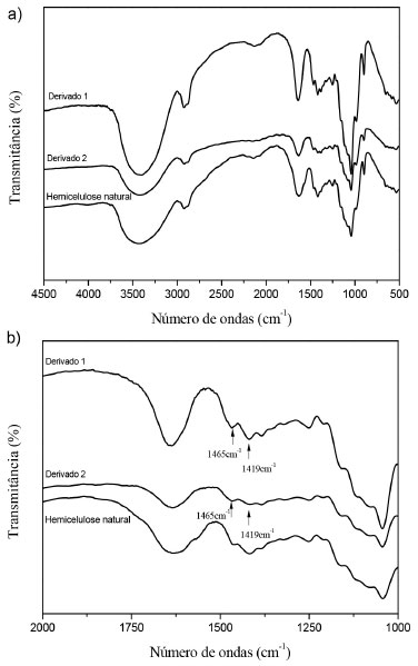 ![]() Figura 3. Espectros de FTIR da hemicelulose natural e dos derivados catiônicos 1e 2: a) 4500 a 500 cm-1; e b) expansão da região de 2000 a 1000 cm-1