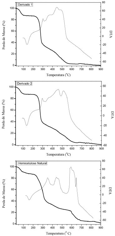 ![]() Figura 4. Termogramas TG/DTA da hemicelulose natural e dos derivados catiônicos 1 e 2