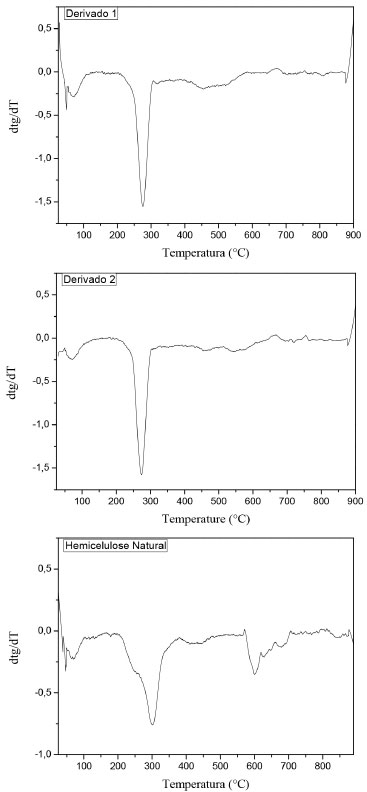 ![]() Figura 5. Curvas DTG da hemicelulose natural e dos derivados catiônicos 1 e 2