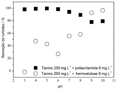 ![]() Figura 6. Variação da remoção de turbidez em função do pH para aplicação de tanino (coagulante primário) e poliacrilamida ou hemicelulose catiônica (floculantes) no tratamento de efluente de lavanderia industrial