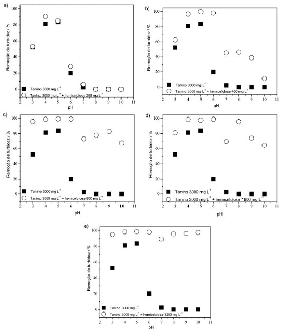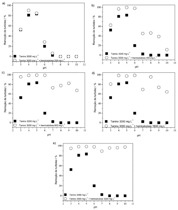 A aplicação do tanino associado à poliacrilamida forneceu valores próximos a 100% de remoção de turbidez em pHs ácidos e próximo a região do pH neutro, sendo reduzidos para aproximadamente 80% na faixa básica. Nesta faixa de dosagem, o processo de coagulação do tanino acontece principalmente pelo mecanismo de arraste em que as interações ocorrem em maior quantidade e envolvem todas as partículas que participam do sistema em suspensão do efluente.26 A poliacrilamida, um polímero de elevada massa molecular, atua como floculante, densificando os coágulos formados do coagulante tanino com consequente sedimentação. Cabe ressaltar uma ligeira redução nas remoções de turbidez para a faixa básica de pH, considerando a baixa dosagem de coagulante utilizada para tal efluente contendo elevada quantidade de sólidos suspensos e sedimentáveis.27 Desta forma, sugere-se que o aumento do pH inibe o predomínio de cargas do coagulante, resultando em uma menor remoção dos sólidos suspensos e da turbidez.28 Já para a associação do tanino às hemiceluloses catiônicas-1 (aplicada na mesma dosagem do PAC) valores de remoção de turbidez inferiores a 60% foram observados para pHs ácidos e neutro, com crescente melhoria da remoção de turbidez em pHs acima de 8, na qual a ação coagulante do tanino é desfavorecida.29 No entanto, considerou-se que tais dosagens aplicadas foram insuficientes para que o processo de coagulação ocorresse de forma efetiva. Apesar disso, tais remoções ainda assim foram maiores que as apresentadas somente para aplicação de tanino como coagulante. Investigação das hemiceluloses catiônicas-1 como auxiliar de coagulação A dosagem do coagulante tanino foi então fixada em 3000 mg L-1, dosagem mínima em que o coagulante, quando aplicado sozinho, promovia de forma eficiente o processo de coagulação em regiões ácidas, e a de hemicelulose catiônica-1 foi aumentada gradativamente de 200 até 3200 mg L-1, visando uma melhoria na eficiência de tratamento sem a utilização de PAC. Cabe inicialmente ressaltar que as oscilações de remoção de turbidez observadas para aplicação do tanino sozinho (3000 mg L-1) ocorreram na região de dosagem mínima deste para o efluente em questão, considerando a elevada concentração de sólidos já mencionada. As Figuras 7a a 7e apresentam a variação da remoção da turbidez em função do pH para o efluente de lavanderia industrial tratado com tanino contendo diferentes concentrações de hemiceluloses catiônicas (de 200 até 3200 mg L-1).