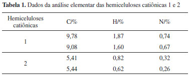 PARTE EXPERIMENTAL Materiais A palha de milho utilizada na obtenção da hemicelulose foi previamente lavada com água destilada, seca a 50 ºC por 24 horas e armazenada em temperatura ambiente. Os reagentes hidróxido de potássio, hidróxido de sódio, etanol 98%, ácido acético glacial, ácido clorídrico e dimetilsulfóxido foram adquiridos da empresa Vetec e o cloreto de 2,3-epoxipropiltrimetilamônio (ETA) e o clorito de sódio foram adquiridos da empresa Sigma-Aldrich. O Tanino Tanfloc SL, com viscosidade média acima de 50 segundos medidos em copo Ford número 4, pH do xarope variando entre 1,3-2,5, sólidos totais entre 23%-37%, foi obtido da empresa TANAC S. A. Todos os reagentes são de grau analítico e foram utilizados sem purificação adicional. Os efluentes foram provenientes de uma Lavanderia Industrial com unidades em Belo Horizonte-Minas Gerais e Arujá-São Paulo. Obtenção da hemicelulose O isolamento da hemicelulose A foi realizado de acordo com o procedimento de Vieira et al.1 Síntese do derivado de hemicelulose catiônica Para a obtenção dos derivados catiônicos foi realizado o procedimento a seguir, o qual foi adaptado de Ren et al.6 Em 0,5 g de hemicelulose (0,0076 mol de grupo OH-) foram adicionados em 5 mL de água destilada e deixou-se agitando a 60 ºC por 30 min. Adicionou-se 0,7 g de NaOH e deixou-se agitando por 20 min. A seguir, adicionou-se o ETA na proporção estabelecida de acordo com o número de grupos OH, ou seja, para o derivado 1 razão molar ETA/OH das xilanas igual a 3 e o derivado 2 razão molar ETA/OH das xilanas igual a 6, deixou-se agitando por 30 min, adicionou-se 1,1 g de NaOH e manteve-se o meio reacional sob agitação a 60 ºC por 5 horas. Ao final, o meio reacional foi resfriado, neutralizado com HCl e a hemicelulose catiônica foi precipitada com etanol 98% e filtrada em funil de placa porosa número 4. Os derivados 1 e 2 foram dissolvidos em água e reprecipitados com etanol 98%. Determinação do rendimento e do grau de substituição (GS) O cálculo do grau de substituição (GS) foi realizado através da quantidade de nitrogênio e carbono que o derivado catiônico da hemicelulose possui, de acordo com a equação 1:21 ![]() Para o cálculo do rendimento foi considerado que quando um GS igual a 2,0 for obtido, o rendimento será de 100%, e para um GS de 0,0 o rendimento será de 30,3%.22 Os dados da análise elementar utilizados para a determinação do GS dos derivados catiônicos 1 e 2 são mostrados na Tabela 1.