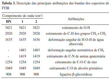 De acordo com Gaspár et al.,21 a xilana é o principal tipo de açúcar presente na hemicelulose da palha de milho, portanto, predominam unidades de β-D-xilose. Isto faz com que a hemicelulose da palha de milho contenha, predominantemente, duas hidroxilas por unidade de β-D-xilose disponíveis para serem eterificadas. Deste modo, de acordo com Gaspar et al.,21 para o cálculo da razão molar, considera-se que a hemicelulose seja constituída apenas de xilose (MM=132). O aumento da concentração de ETA não resultou em maior grau de substituição. Isso ocorreu porque, como se manteve a concentração de NaOH constante, não havia mais oxigênios desprotonados de grupos glicosídicos para reagir. Além disso, o excesso de NaOH provocou a hidrólise do epóxido do ETA, reduzindo o GS. Neste caso, seria necessário aumentar também a proporção ETA/NaOH. Entretanto, isso não foi realizado, pois, segundo Ren et al.,6 o aumento desta proporção eleva a clivagem das ligações glicosídicas, reduzindo o tamanho da cadeia polimérica. Ambos os derivados, ao contrário da hemicelulose natural, apresentaram-se solúveis em água, sendo que as hemiceluloses catiônicas-1 apresentaram maior solubilidade que as hemiceluloses catiônicas-2, provavelmente devido à maior presença de grupos catiônicos, comprovado pelo maior grau de substituição observado. Caracterização por espectroscopia no infravermelho A Figura 3 apresenta o espectro na região do infravermelho da hemicelulose natural (NH) e dos derivados catiônicos 1 e 2. Observa-se na Figura 3a que tanto a hemicelulose natural como as catiônicas possuem bandas características nas regiões: 3421 cm-1 devido ao estiramento das ligações O-H, 2920 cm-1 característico de estiramento de ligações C-H de grupos CH2 e CH3, 1635 cm-1 deformação angular de ligação H-O-H da água absorvida pela amostra, 1475 cm-1 relacionadas à deformação assimétrica de CH3, 1419 cm-1 estiramento de C-N de amina quaternária, 1254 cm-1 referente ao estiramento de ligação C-O-C de grupos etílicos, 1049 cm-1 devido ao estiramento das ligações C-O de alcoóis primários e 908 cm-1 estiramento característico das ligações β-glicosídicas entre as unidades de açúcar existentes nas hemiceluloses. A Tabela 3 mostra as principais atribuições das bandas.