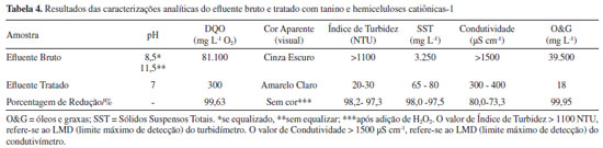 As faixas de atuação do tanino aplicado sozinho ou do tanino associado às hemiceluloses catiônicas-1 (quando aplicada em dosagem de até 400 mg L-1) apresentaram remoções de turbidez semelhantes para toda a faixa de pH investigada. Acima desta dosagem, foi verificado um aumento nas remoções de turbidez na região de pHs básicos, na qual a atuação do coagulante primário tanino era limitada. Para dosagens semelhantes entre o coagulante principal tanino e do auxiliar de coagulação hemiceluloses catiônicas-1, verificou-se remoções de turbidez superiores a 95% para toda faixa de pH investigada e considerando-se o alto teor de sólidos suspensos e de turbidez do efluente (maior que 1100 NTU). Estes resultados sugerem um efeito sinérgico entre as atuações de ambos e representam não necessidade de uma etapa de adequação de pH do efluente antes da etapa de coagulação. Duas possibilidades de mecanismos de atuações podem ser sugeridas: a primeira é a de que as hemiceluloses, por possuírem um pKa maior que o do tanino, num dado pH ela possua grupos funcionais disponíveis diferentes daqueles existentes na estrutura do tanino para o processo complementar de coagulação; a segunda é a de que as hemiceluloses estejam interagindo com tanino, evitando a formação de micelas e, portanto, tanto o coagulante quanto o auxiliar de coagulação estariam mais susceptíveis à coagulação. Porém, investigações mais detalhadas quanto à forma de aplicação de ambos os polímeros de fontes renováveis necessitam ser realizadas. Tratamento físico químico do efluente Após retirada de óleos e graxas (pelo abaixamento do pH até 2) seguida de equalização até pH 11,5, os coagulantes (tanino) e auxiliares (hemiceluloses catiônicas) foram aplicados conjuntamente nas dosagens de 3000 mg L-1 e 3200 mg L-1, respectivamente. A Tabela 4 apresenta os resultados das caracterizações analíticas dos efluentes bruto e tratado com tanino (3000 mg L-1) e hemiceluloses catiônicas-1 (3200 mg L-1).