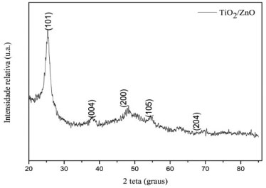 A Figura 4 mostra o difratograma obtido para o catalisador binário TiO2/ZnO. Por este difratograma não foi possível observar os padrões hkl de difração do óxido de zinco, pois houve deslocamento do plano cristalográfico característico do ZnO para região de 2 teta menor, indicando que o zinco está entrando na fase anatase do TiO2 (JCPDS 21-1272), o que pode indicar a formação de solução sólida entre os óxidos. Esse catalisador apresentou tamanho de cristalito, usando como base o hkl (101), de 37,3 nm.