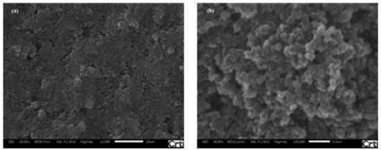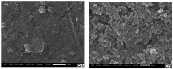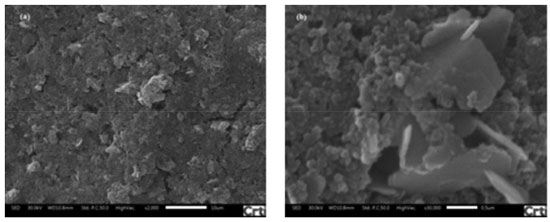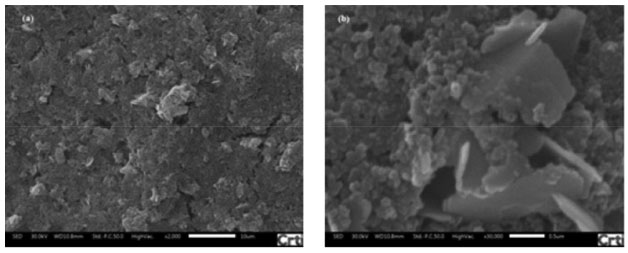Os resultados obtidos por DRX mostram a formação de uma fase anatase estável, tanto para os catalisadores de TiO2, quanto para os catalisadores binários de TiO2/ZnO. Além disso, todos os catalisadores apresentaram tamanhos de partícula adequados para a utilização em processos de fotocatálise. Outros métodos de preparo de fotocatalisadores também tem relatado obtenção de materiais que apresentam alta área superficial com tamanhos de partícula da ordem de nanômetros. Bakar e colaboradores13 relataram em seu trabalho de degradação do corante alaranjado de metila com fotocalisadores de TiO2 N-dopados que os catalisadores com maior quantidade de nitrogênio apresentaram menores tamanhos de partícula. Neste trabalho, foi observado um aumento no tamanho de partícula para os catalisadores contendo ZnO, entretanto todos os catalisadores possuem partículas na ordem de nanômetros e alta área superficial. Microscopia Eletrônica de Varredura As Figura 5, 6 e 7 mostram as micrografias, obtidas por MEV, das amostras de catalisadores de TiO2, ZnO e TiO2/ZnO, respectivamente. Pelas micrografias dos catalisadores (Figuras 5, 6 e 7) verifica-se a formação das nanopartículas e na imagem obtida com o catalisador de ZnO (Figura 6) fica evidente a formação de aglomerados, que podem estar relacionados a sinterização do material, devido ao processo de preparação dos catalisadores envolver a calcinação dos mesmos em temperaturas relativamente elevadas.