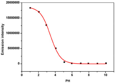 ![]() Figure 1. Effect of pH on the fluorescence of RBMAB (20 µmol L-1) in ethanol-H2O solutions (3:2 v/v). The excitation and emission wavelengths were 562 nm and 582 nm, respectively