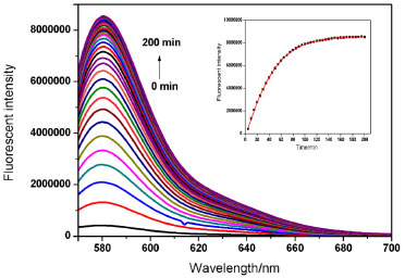 ![]() Figure 2. Fluorescence spectra of RBMAB (20 µmol L-1) with Fe3+ (200 µmol L-1, 10 eq.). The excitation and emission wavelengths were 562 and 582 nm, respectively. Inset: plot of the fluorescence intensities at 582 nm over a period of 180 min.