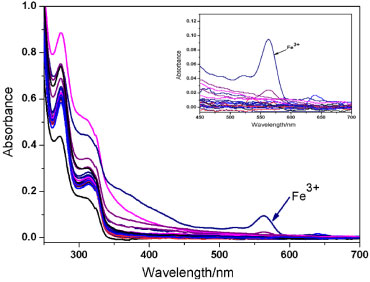 UV-vis spectral response of RBMAB To evaluate the selectivity of RBMAB for Fe3+, the sensing ability of RBMAB toward different metal cations was studied using UV-Vis spectroscopy. As shown in Figure 3, the UV-vis spectrum of RBMAB (20 µmol L-1) in an ethanol-H2O (3:2 v/v, PBS buffer, 1.2 mmol L-1, pH 7.2) solution exhibits notably weak absorbance at 562 nm. The addition of 10 equiv. Fe3+ (200 µmol L-1) into the solution significantly enhances the absorbance at 562 nm. Under the identical condition, no obvious response was observed at 562 nm after other metal ions Al3+, Ba2+, Ca2+, Cd2+, Co2+, Cr3+, Cs2+, Cu+, Cu2+, Fe2+, Fe3+, Hg2+, K+, Li+, Mg2+, Mn2+, Na+, Ni2+, Pb2+ and Zn2+ were added, while a relative small enhancement by addition of Ag+. The results demonstrate that RBMAB can serve as an excellent selective chemosensor for Fe3+ in an ethanol-H2O (3:2 v/v, PBS buffer, 1.2 mmol L-1, pH 7.2) solution.